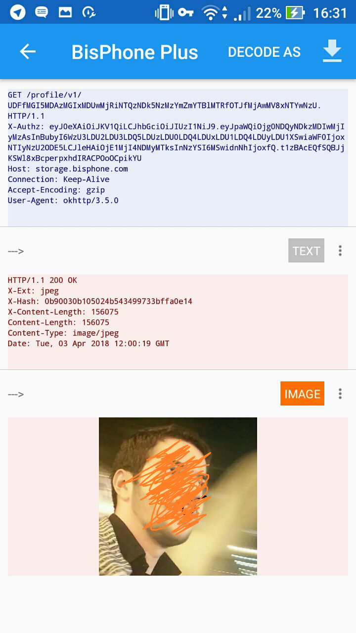 همون طور که در عکس می‌بینید، این پیام رسان، پیام‌های ارسالی رو رمز می کنه و تا جای خوبی غیرقابل decode شدن هست. اما یه مشکل داره و اون اینه که عکس های “پروفایل” مخاطبین شما در بیسفون میتونه به راحتی توسط هکرها مشاهده بشن.