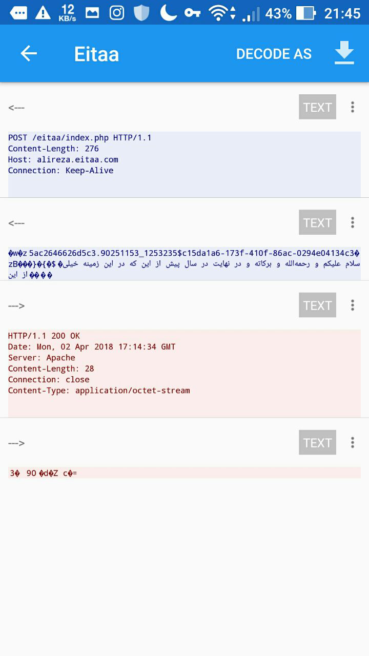 این روزا بحث پیام رسان های ایرانی و امنیت شون داغ هست. منم به نوبه خودم اومدم پیام رسانهای مختلف ایرانی رو بررسی کردم و از لحاظ امنیت و رمزنگاری نقاط قوت و ضعفشون رو ذکر کردم. لازم به ذکره که از نرم افزار packet capture استفاده کردم که از تکنیک man-in-the-middle استفاده می‌کنه؛ یعنی اینکه هر فردی میتونه به این اطلاعات دسترسی داشته باشه.